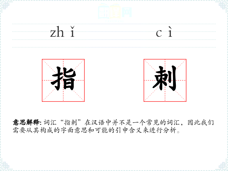 词汇“指刺”在汉语中并不是一个常见的词汇,因此我们需要从其构成的字面意思和可能的引申含义来进行分析。