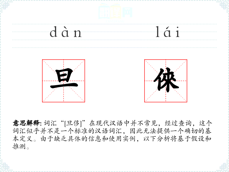 词汇“[旦侈]”在现代汉语中并不常见,经过查询,这个词汇似乎并不是一个标准的汉语词汇,因此无法提供一个确切的基本定义。由于缺乏具体的信息和使用实例,以下分析将基于假设和推测。