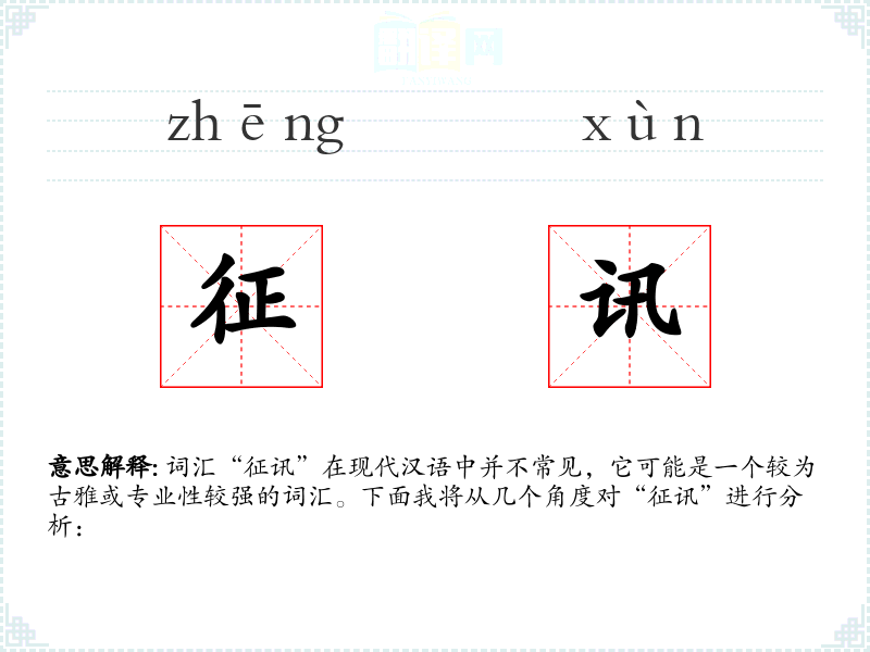 词汇“征讯”在现代汉语中并不常见,它可能是一个较为古雅或专业性较强的词汇。下面我将从几个角度对“征讯”进行分析: