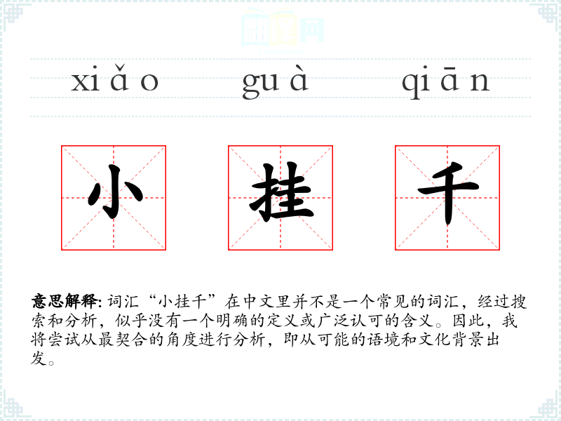 由于“小挂千”不是一个标准词汇,我们无法给出一个确切的字面意思和基本含义。它可能是某个地区方言中的词汇,或者是某个特定社群中的俚语。