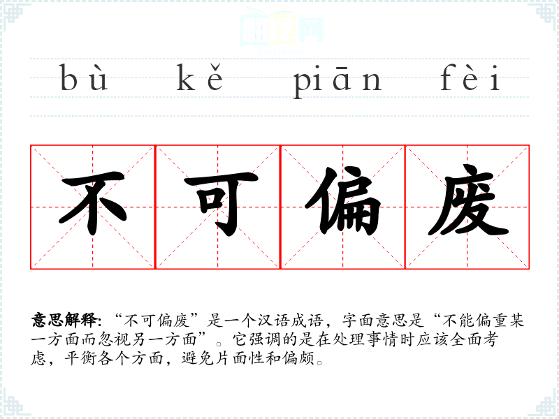 “不可偏废”是一个汉语成语,字面意思是“不能偏重某一方面而忽视另一方面”。它强调的是在处理事情时应该全面考虑,平衡各个方面,避免片面性和偏颇。