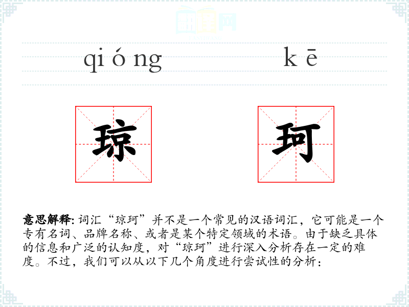 由于“琼珂”不是一个标准词汇,我们无法给出确切的基本定义。它可能是由两个汉字组合而成的名字或特定用途的词汇。