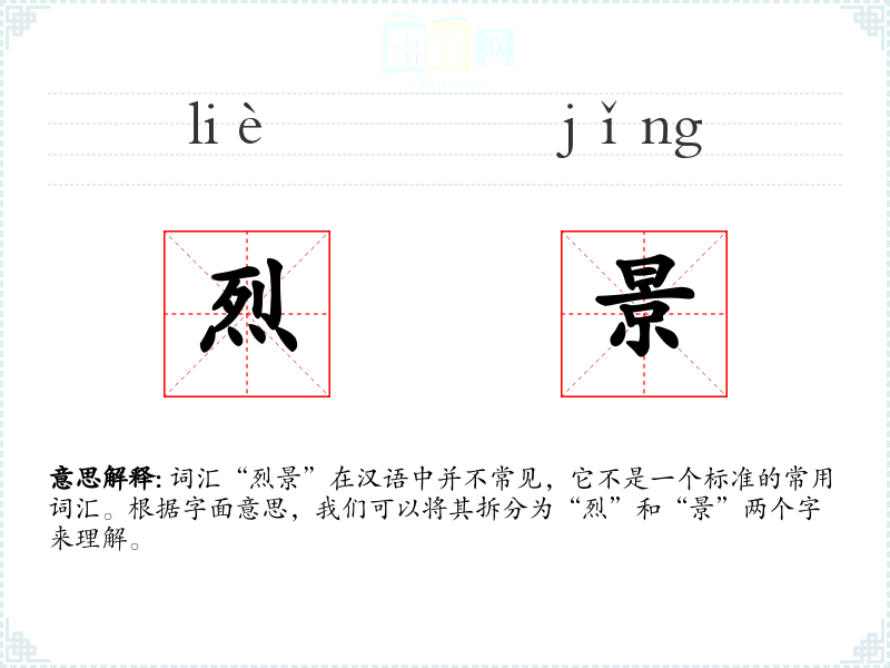 词汇“烈景”在汉语中并不常见,它不是一个标准的常用词汇。根据字面意思,我们可以将其拆分为“烈”和“景”两个字来理解。