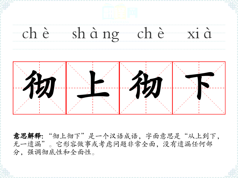 “彻上彻下”是一个汉语成语,字面意思是“从上到下,无一遗漏”。它形容做事或考虑问题非常全面,没有遗漏任何部分,强调彻底性和全面性。