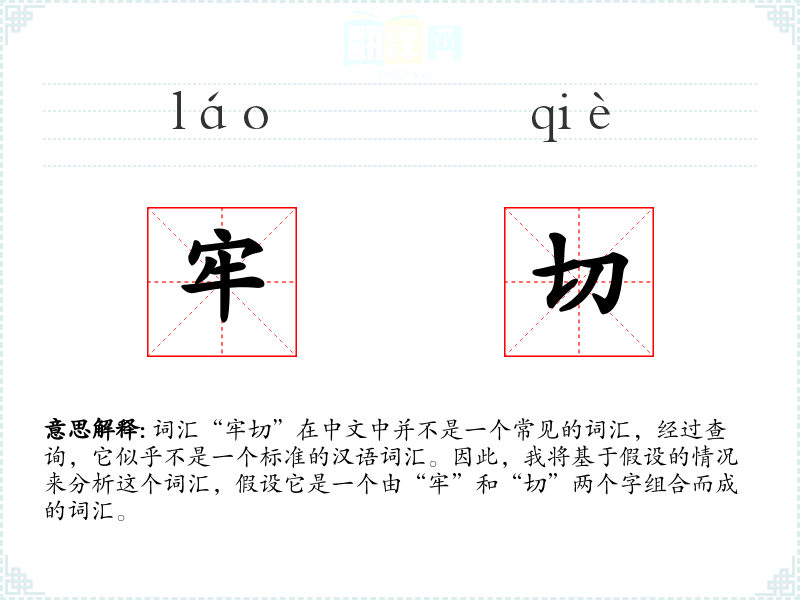 词汇“牢切”在中文中并不是一个常见的词汇,经过查询,它似乎不是一个标准的汉语词汇。因此,我将基于假设的情况来分析这个词汇,假设它是一个由“牢”和“切”两个字组合而成的词汇。