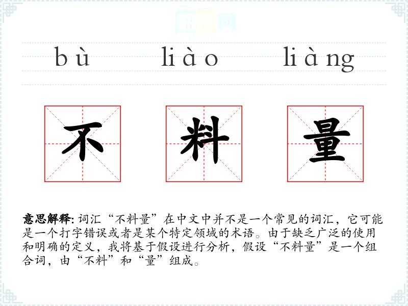 词汇“不料量”在中文中并不是一个常见的词汇,它可能是一个打字错误或者是某个特定领域的术语。由于缺乏广泛的使用和明确的定义,我将基于假设进行分析,假设“不料量”是一个组合词,由“不料”和“量”组成。