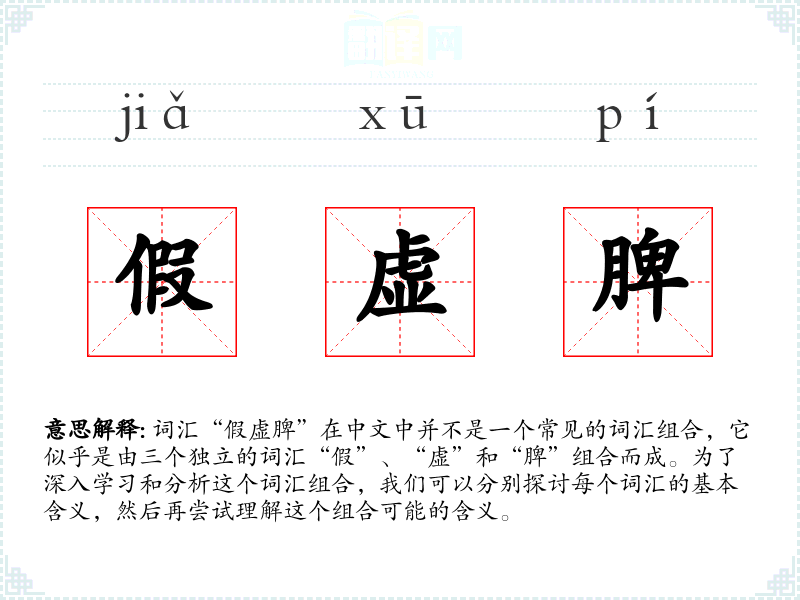 词汇“假虚脾”在中文中并不是一个常见的词汇组合,它似乎是由三个独立的词汇“假”、“虚”和“脾”组合而成。为了深入学习和分析这个词汇组合,我们可以分别探讨每个词汇的基本含义,然后再尝试理解这个组合可能的含义。