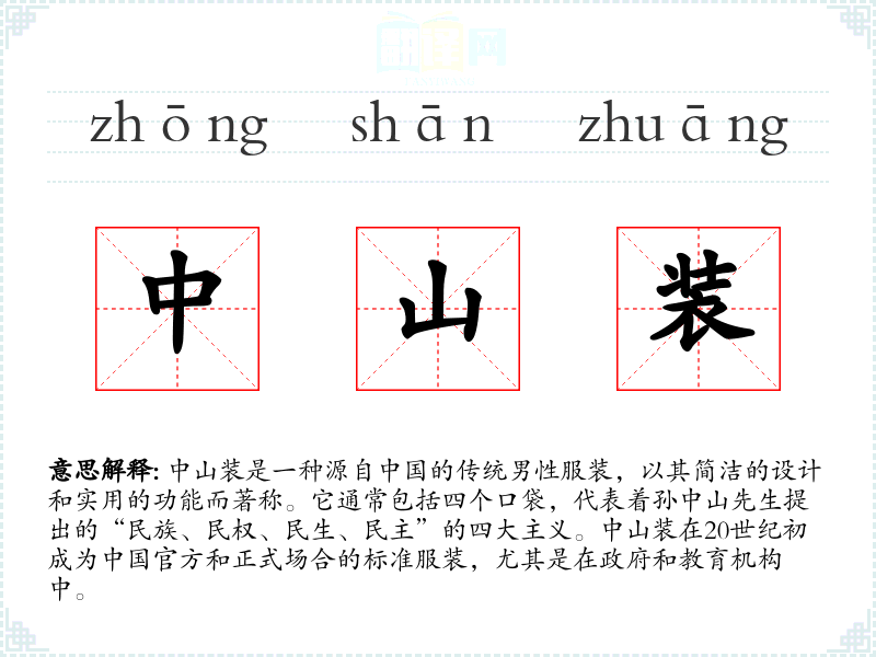中山装不仅是一种服装,更是一种文化和历史的载体。了解和学*中山装,有助于我们更好地理解*的历史和文化,以及它在现代社会中的地位和意义。在语言学和表达中,正确使用中山装这一词汇,可以丰富我们的语言表达,增强文化敏感性。