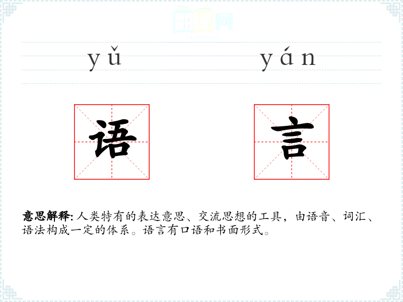 人类特有的表达意思、交流思想的工具,由语音、词汇、语法构成一定的体系。语言有口语和书面形式。