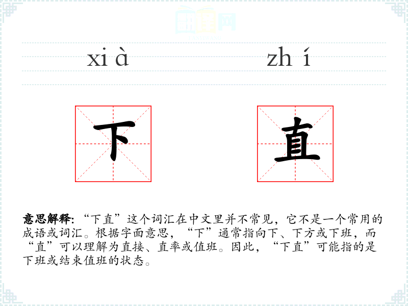 由于“下直”不是一个常用词汇,其词源和演变不详。它可能是由“下”和“直”两个字组合而成,用以描述一种状态或行为。