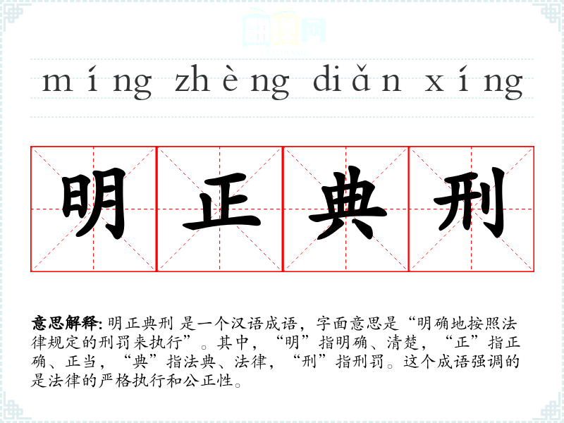 明正典刑 是一个汉语成语,字面意思是“明确地按照法律规定的刑罚来执行”。其中,“明”指明确、清楚,“正”指正确、正当,“典”指法典、法律,“刑”指刑罚。这个成语强调的是法律的严格执行和公正性。