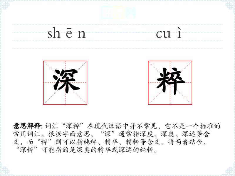 由于“深粹”不是一个常用词汇,它在不同语言或文化中的对应词汇及其使用情况不详。