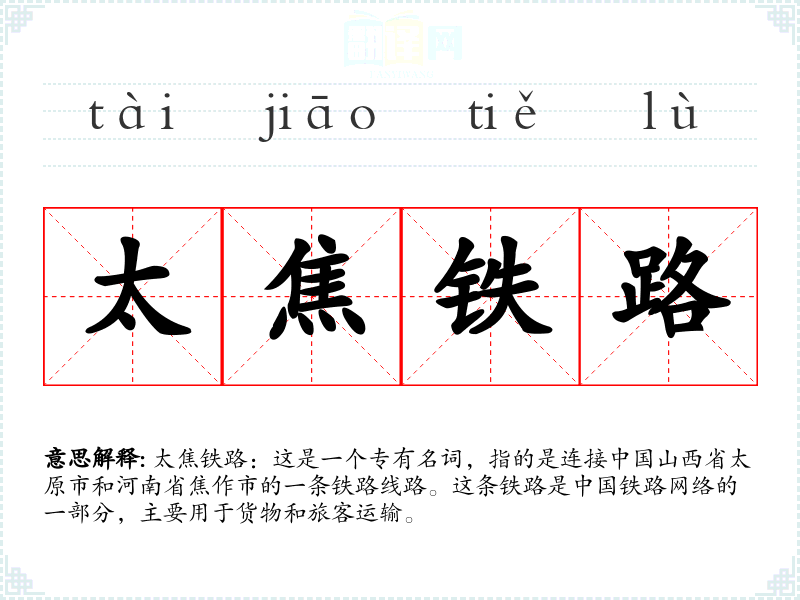 太焦铁路:这是一个专有名词,指的是连接山西省太原市和河南省焦作市的一条铁路线路。这条铁路是铁路网络的一部分,主要用于货物和旅客运输。