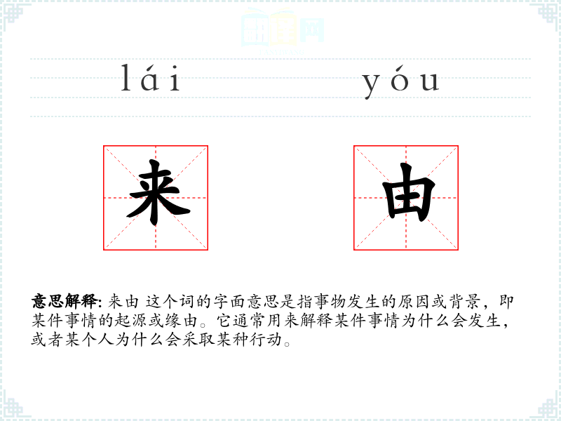 来由 这个词的字面意思是指事物发生的原因或背景,即某件事情的起源或缘由。它通常用来解释某件事情为什么会发生,或者某个人为什么会采取某种行动。