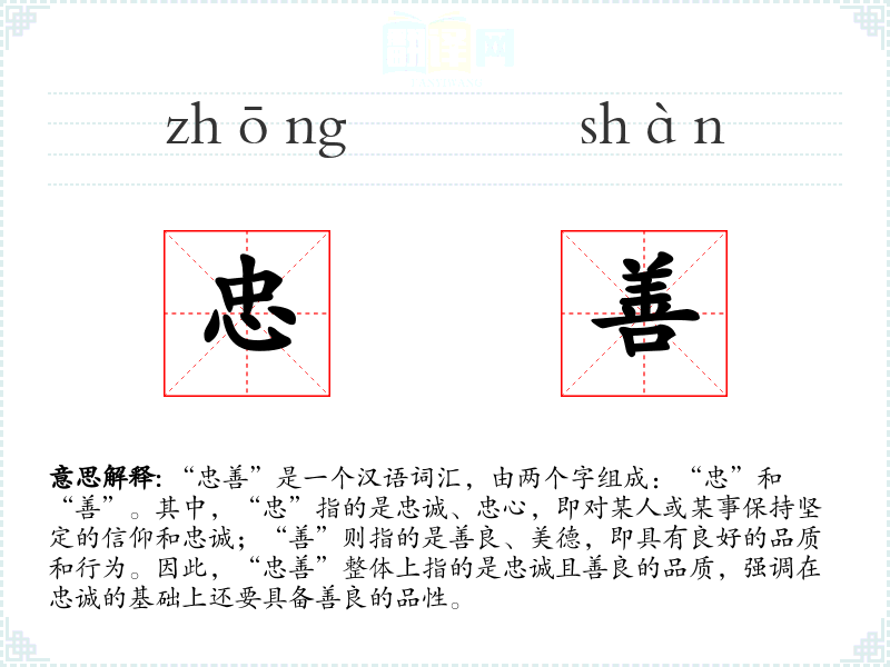 “忠善”是一个汉语词汇,由两个字组成:“忠”和“善”。其中,“忠”指的是忠诚、忠心,即对某人或某事保持坚定的信仰和忠诚;“善”则指的是善良、美德,即具有良好的品质和行为。因此,“忠善”整体上指的是忠诚且善良的品质,强调在忠诚的基础上还要具备善良的品性。