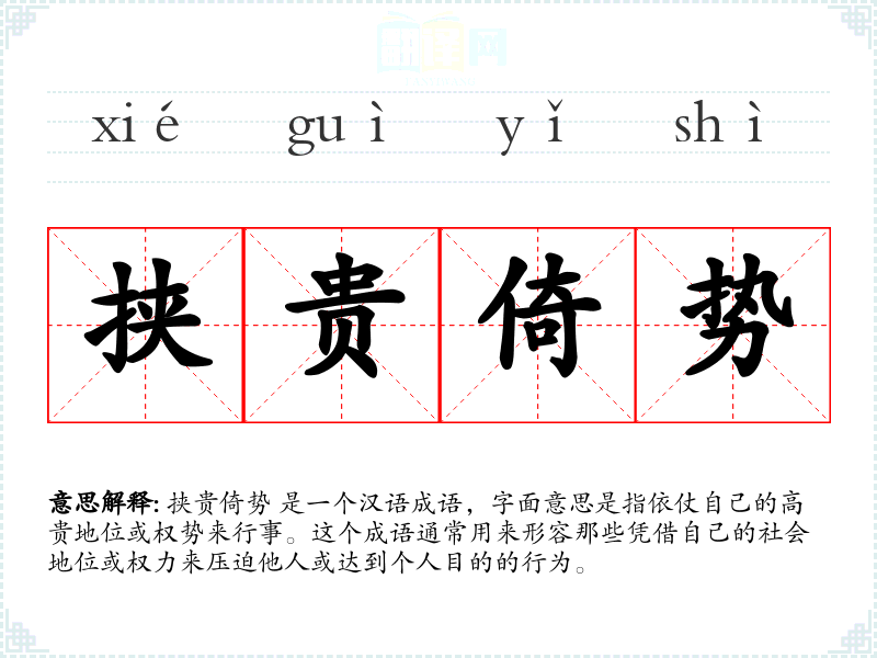 挟贵倚势 这个成语的词源较为明确,由“挟”(依仗)、“贵”(高贵)、“倚”(依靠)、“势”(权势)四个字组成。在古代汉语中,这个成语就已经存在,用来描述那些依仗自己地位和权力的人。