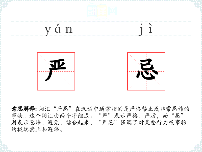 - 词源:“严”和“忌”都是古代汉语中的常用字,组合起来形成“严忌”这个词汇,强调了禁止的严格性。