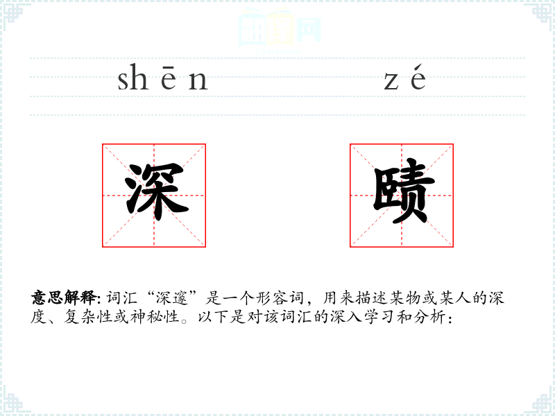 词汇“深邃”是一个形容词,用来描述某物或某人的深度、复杂性或神秘性。以下是对该词汇的深入学*和分析: