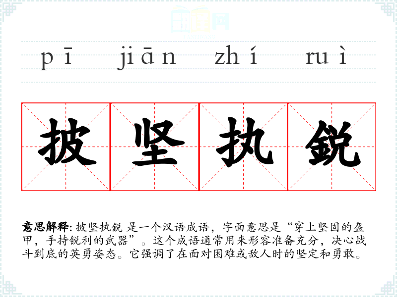披坚执鋭 是一个汉语成语,字面意思是“穿上坚固的盔甲,手持锐利的武器”。这个成语通常用来形容准备充分,决心战斗到底的英勇姿态。它强调了在面对困难或敌人时的坚定和勇敢。