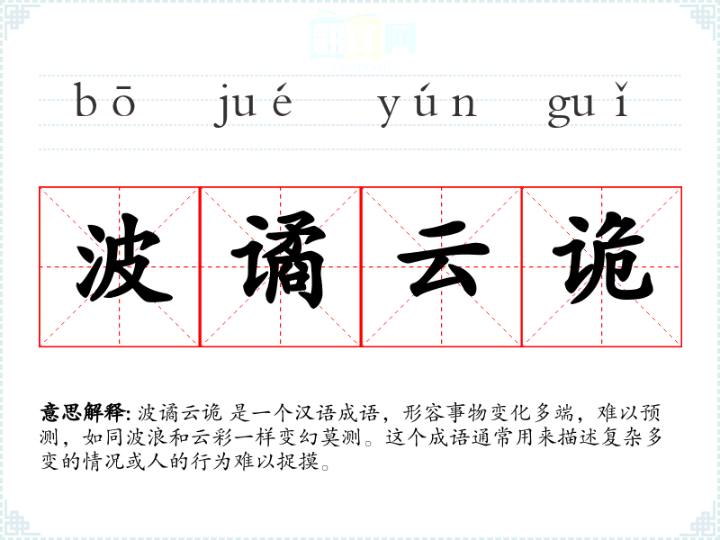 波谲云诡 是一个汉语成语,形容事物变化多端,难以预测,如同波浪和云彩一样变幻莫测。这个成语通常用来描述复杂多变的情况或人的行为难以捉摸。