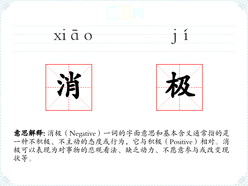 消极(Negative)一词的字面意思和基本含义通常指的是一种不积极、不主动的态度或行为,它与积极(Positive)相对。消极可以表现为对事物的悲观看法、缺乏动力、不愿意参与或改变现状等。