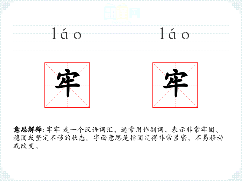 牢牢 是一个汉语词汇,通常用作副词,表示非常牢固、稳固或坚定不移的状态。字面意思是指固定得非常紧密,不易移动或改变。