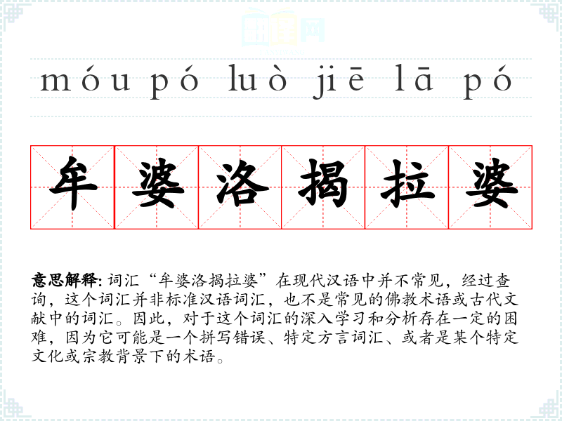 由于“牟婆洛揭拉婆”不是一个已知的词汇,我们无法对其进行深入的分析和总结。在语言学*和表达中,了解和使用准确的词汇是非常重要的,这有助于确保沟通的清晰性和有效性。如果这个词汇确实存在,建议进一步的研究和查询以确定其确切的含义和用法。