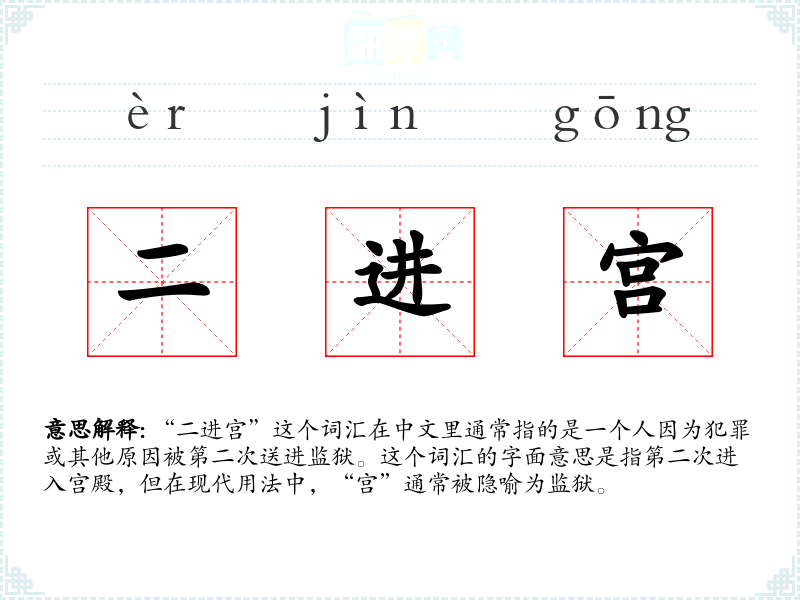 “二进宫”这个词汇在中文里通常指的是一个人因为犯罪或其他原因被第二次送进监狱。这个词汇的字面意思是指第二次进入宫殿,但在现代用法中,“宫”通常被隐喻为监狱。