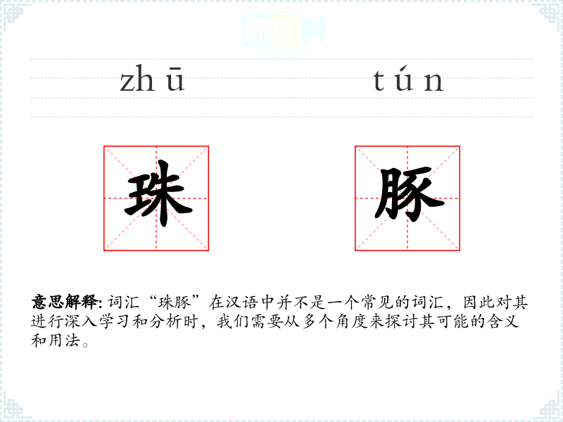 “珠豚”字面意思是由“珠”和“豚”两个字组成。其中,“珠”通常指珍珠,是一种珍贵的宝石;“豚”则指猪,是一种常见的家畜。将两者结合,“珠豚”可能指的是一种珍贵的猪,或者是一种比喻用法,形容某物既有猪的特性又有珍珠的价值。