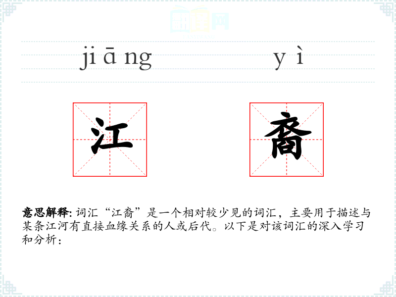 词汇“江裔”是一个相对较少见的词汇,主要用于描述与某条江河有直接血缘关系的人或后代。以下是对该词汇的深入学*和分析: