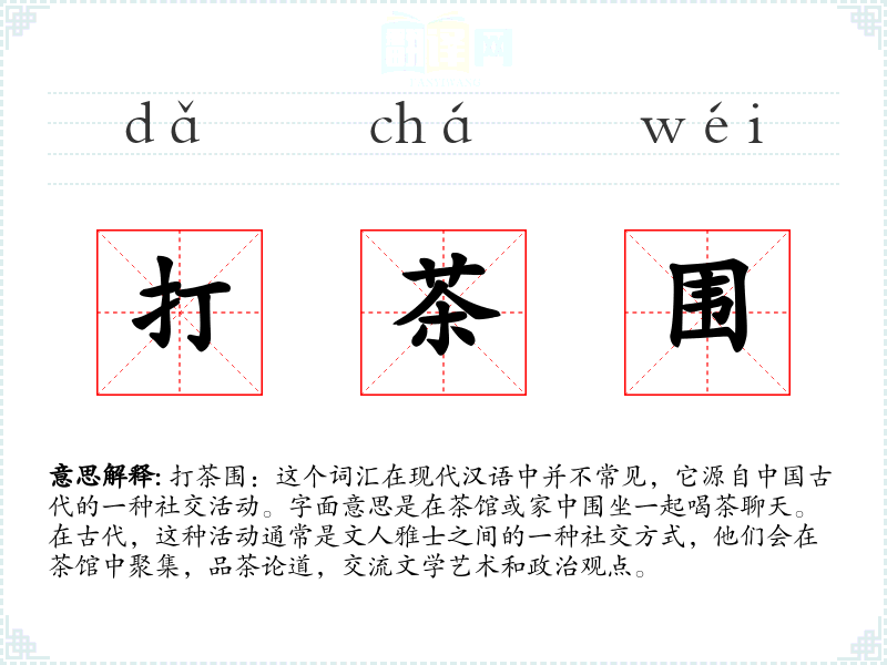 打茶围:这个词汇在现代汉语中并不常见,它源自**古代的一种社交活动。字面意思是在茶馆或家中围坐一起喝茶聊天。在古代,这种活动通常是文人雅士之间的一种社交方式,他们会在茶馆中聚集,品茶论道,交流文学艺术和政治观点。