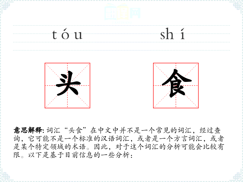 词汇“头食”在中文中并不是一个常见的词汇,经过查询,它可能不是一个标准的汉语词汇,或者是一个方言词汇,或者是某个特定领域的术语。因此,对于这个词汇的分析可能会比较有限。以下是基于目前信息的一些分析: