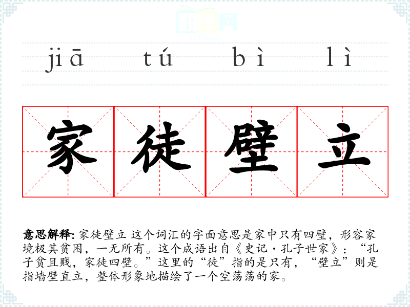 家徒壁立 这个词汇的字面意思是家中只有四壁,形容家境极其贫困,一无所有。这个成语出自《史记·孔子世家》:“孔子贫且贱,家徒四壁。”这里的“徒”指的是只有,“壁立”则是指墙壁直立,整体形象地描绘了一个空荡荡的家。