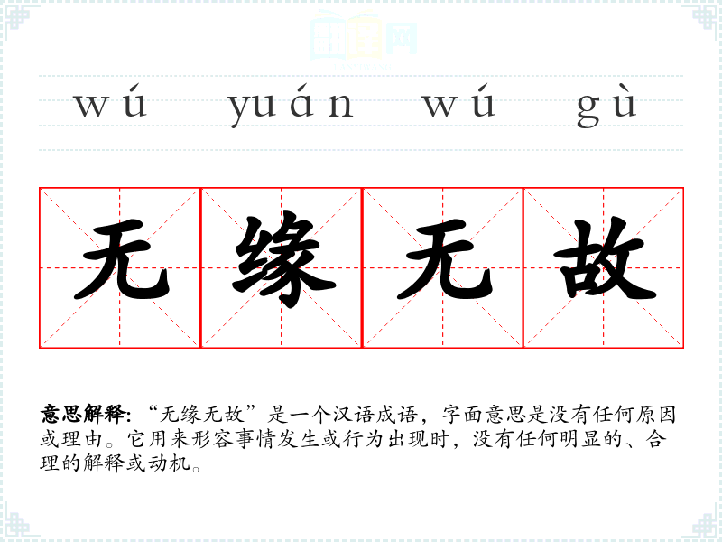 “无缘无故”是一个汉语成语,字面意思是没有任何原因或理由。它用来形容事情发生或行为出现时,没有任何明显的、合理的解释或动机。