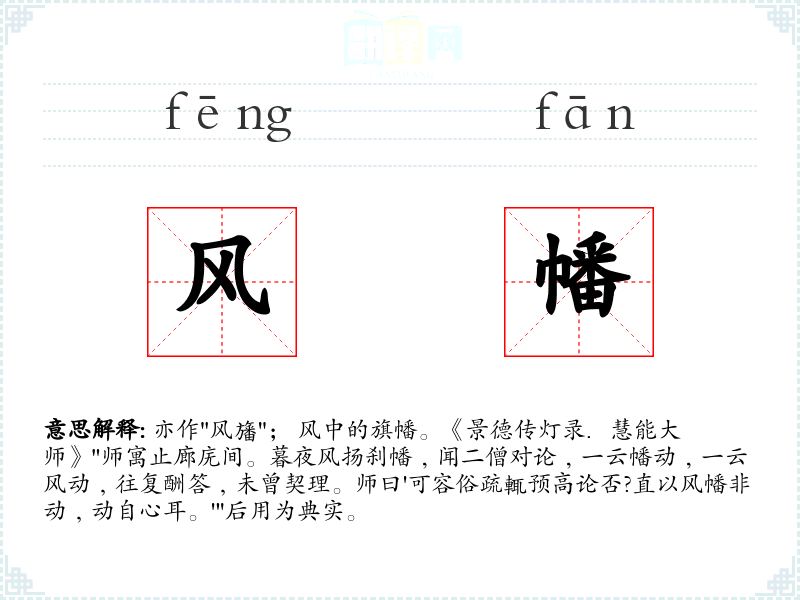 亦作"风旛"; 风中的旗幡。《景德传灯录.慧能大师》"师寓止廊庑间。暮夜风扬刹幡﹐闻二僧对论﹐一云幡动﹐一云风动﹐往复酬答﹐未曾契理。师曰'可容俗疏輒预高论否?直以风幡非动﹐动自心耳。'"后用为典实。