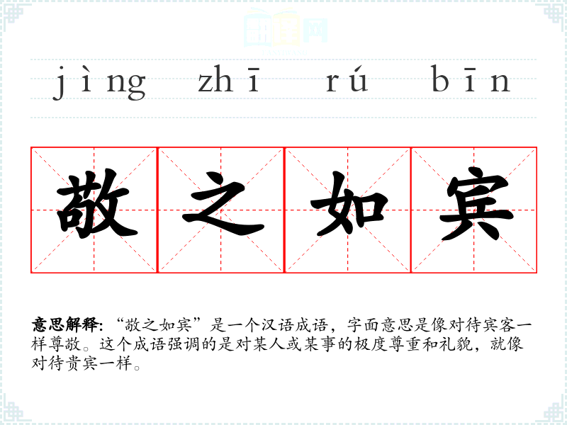 “敬之如宾”是一个汉语成语,字面意思是像对待宾客一样尊敬。这个成语强调的是对某人或某事的极度尊重和礼貌,就像对待贵宾一样。
