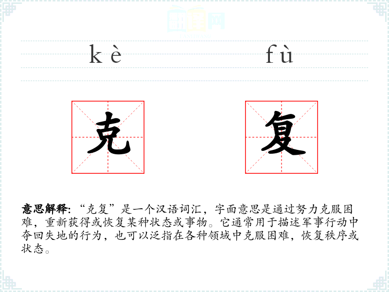 “克复”是一个汉语词汇,字面意思是通过努力克服困难,重新获得或恢复某种状态或事物。它通常用于描述军事行动中夺回失地的行为,也可以泛指在各种领域中克服困难,恢复秩序或状态。
