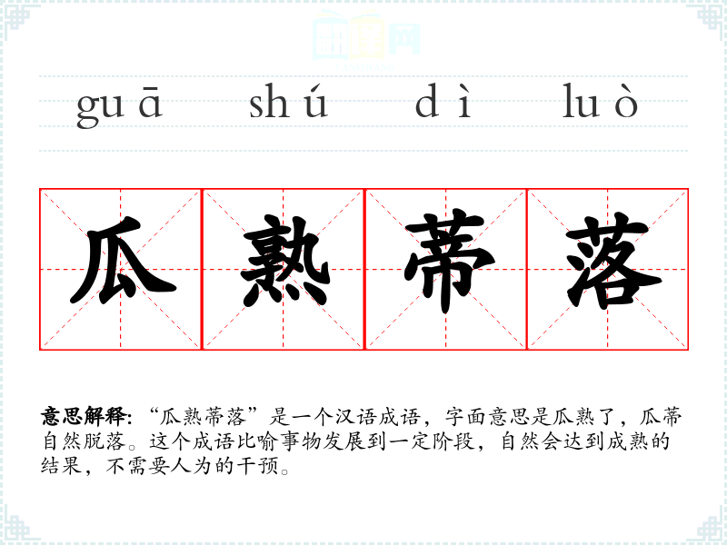 “瓜熟蒂落”这个成语不仅形象生动,而且富含哲理,提醒我们在生活中顺应自然,保持耐心。在语言学*和表达中,它是一个非常有用的工具,能够丰富我们的表达方式,传达深刻的思想。