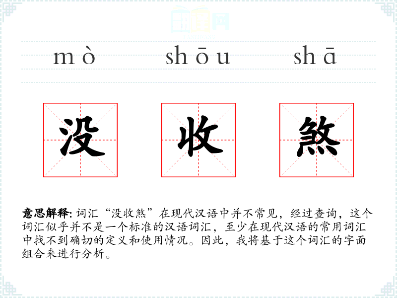 词汇“没收煞”在现代汉语中并不常见,经过查询,这个词汇似乎并不是一个标准的汉语词汇,至少在现代汉语的常用词汇中找不到确切的定义和使用情况。因此,我将基于这个词汇的字面组合来进行分析。