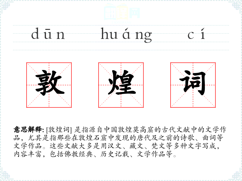 [敦煌词] 是指源自敦煌莫高窟的古代文献中的文学作品,尤其是指那些在敦煌石窟中发现的唐代及之前的诗歌、曲词等文学作品。这些文献大多是用汉文、藏文、梵文等多种文字写成,内容丰富,包括经典、历史记载、文学作品等。