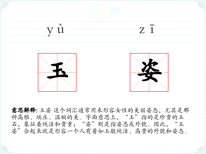 结合图片,可以想象一幅古代仕女图,画中的女子身着华服,面容如玉,姿态优雅。听觉上,可以联想到古筝或琵琶的悠扬旋律,与“玉姿”的意境相得益彰。