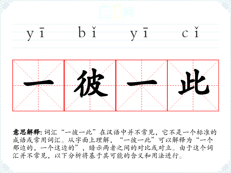 词汇“一彼一此”在汉语中并不常见,它不是一个标准的成语或常用词汇。从字面上理解,“一彼一此”可以解释为“一个那边的,一个这边的”,暗示两者之间的对比或对立。由于这个词汇并不常见,以下分析将基于其可能的含义和用法进行。