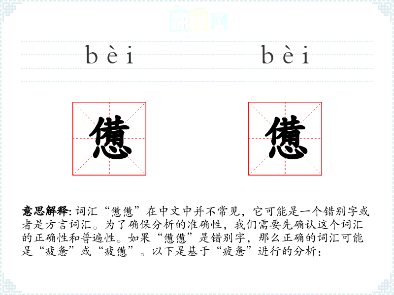 词汇“憊憊”在中文中并不常见,它可能是一个错别字或者是方言词汇。为了确保分析的准确性,我们需要先确认这个词汇的正确性和普遍性。如果“憊憊”是错别字,那么正确的词汇可能是“疲惫”或“疲憊”。以下是基于“疲惫”进行的分析: