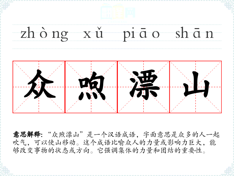 “众煦漂山”这个成语源自**古代的寓言故事,后来被广泛应用于文学和日常语言中。它的词源体现了古人对集体力量和社会团结的重视。