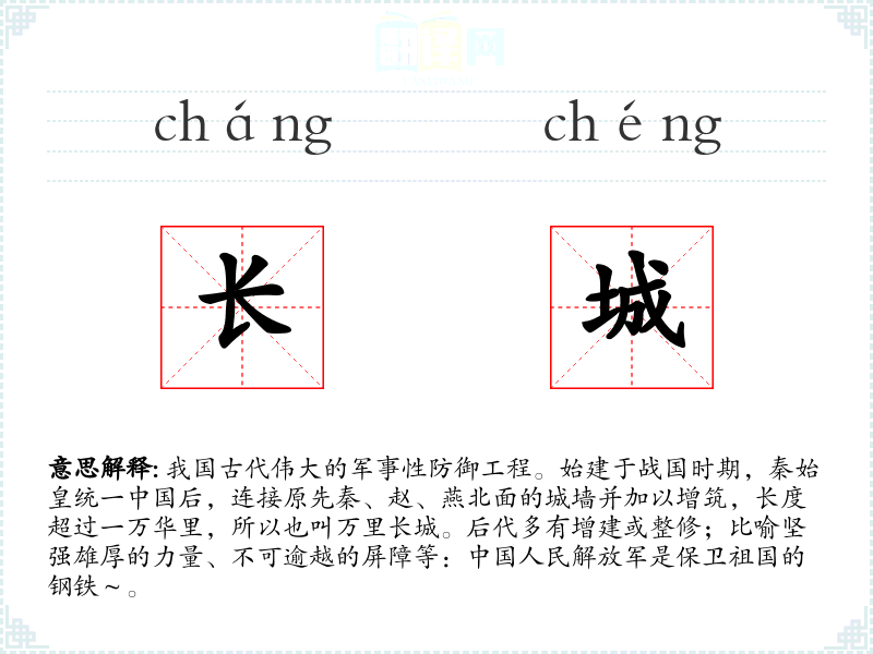 1.我国古代伟大的军事性防御工程。始建于战国时期,秦始皇统一中国后,连接原先秦、赵、燕北面的城墙并加以增筑,长度超过一万华里,所以也叫万里长城。后代多有增建或整修;比喻坚强雄厚的力量、不可逾越的屏障等:中国人民解放军是保卫祖国的钢铁~。