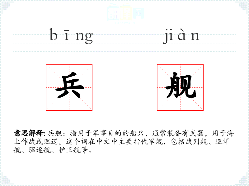 兵舰:指用于军事目的的船只,通常装备有武器,用于海上作战或巡逻。这个词在中文中主要指代军舰,包括战列舰、巡洋舰、驱逐舰、护卫舰等。