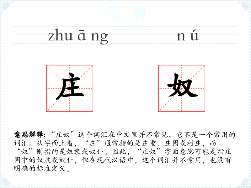 “庄奴”这个词汇在中文里并不常见,它不是一个常用的词汇。从字面上看,“庄”通常指的是庄重、庄园或村庄,而“奴”则指的是奴隶或奴仆。因此,“庄奴”字面意思可能是指庄园中的奴隶或奴仆,但在现代汉语中,这个词汇并不常用,也没有明确的标准定义。