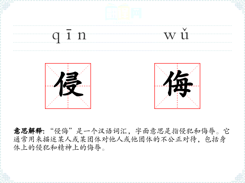 “侵侮”是一个汉语词汇,字面意思是指侵犯和侮辱。它通常用来描述某人或某团体对他人或他团体的不公正对待,包括身体上的侵犯和精神上的侮辱。