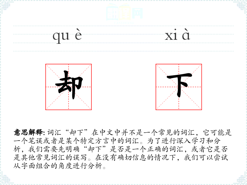 词汇“却下”在中文中并不是一个常见的词汇,它可能是一个笔误或者是某个特定方言中的词汇。为了进行深入学习和分析,我们需要先明确“却下”是否是一个正确的词汇,或者它是否是其他常见词汇的误写。在没有确切信息的情况下,我们可以尝试从字面组合的角度进行分析。