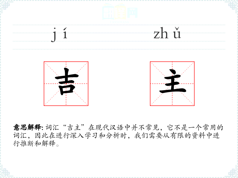 词汇“吉主”在现代汉语中并不常见,它不是一个常用的词汇,因此在进行深入学*和分析时,我们需要从有限的资料中进行推断和解释。